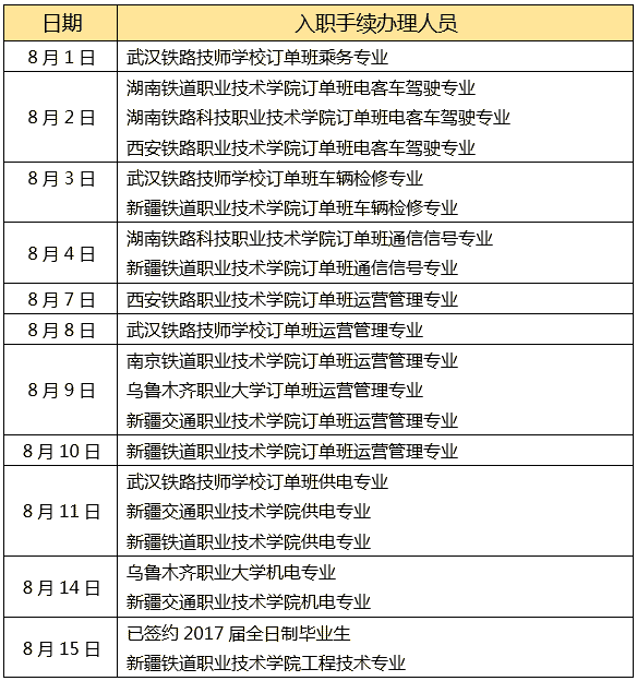 入职手续办理地点:乌鲁木齐市经济技术开发区二期嵩山街北二巷257号城轨集团院内2号楼201室(乘坐309、311、98路公交车,开发区管委会站下车)。入职时间见下表: