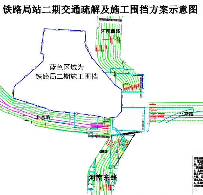 铁路局站是1号线和4号线换乘站,目前,1号线车站部分正在进行二期主体结构施工,在市公安局交警支队、市交通运输局等单位的大力支持及配合下,市轨道办、城轨集团统筹协调,会同各相关单位进行了大量现场实地勘察并作出针对性调整方案。计划5月10日零点起对现状交通方式进行二次导改,直至11月30日。主要围闭现行西侧机动车道(铁路局献血屋一侧)。