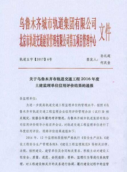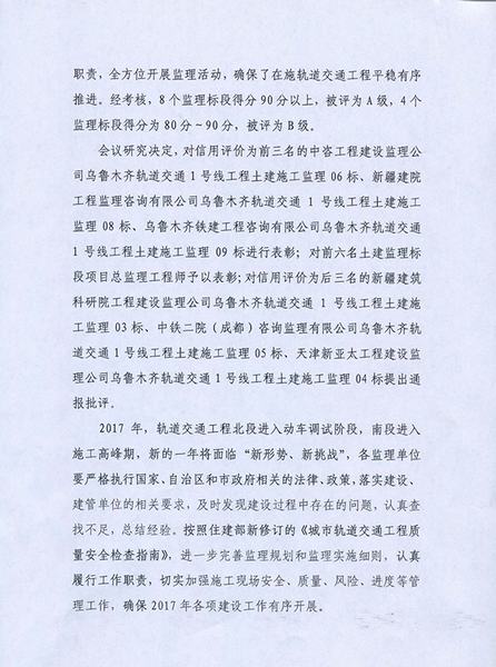 关于乌鲁木齐轨道交通工程2016年度土建监理单位信用评价结果的通报