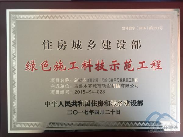 《乌鲁木齐轨道交通一号线13合同段绿色施工系统》课题为2014年城轨集团与轨道交通1号线13合同段中铁隆工程集团有限公司联合在住房城乡建设部申报的绿色施工科技示范工程,经过2年的研究,项目于2016年11月24日通过验收。住房和城乡建设部建筑节能与科技司委托中国土木工程学会总工程师工作委员会对课题进行了验收。验收委员会认为该项目已完成了绿色施工科技示范工程的相关工作和考核指标,项目施工管理可控、组织严密、最大限度地节约了资源,保护了环境和减少了污染,取得了“四节一环保”显著效果,同时也获得了较好的经济和社会效益,具有良好的示范作用及推广意义,同意通过验收。