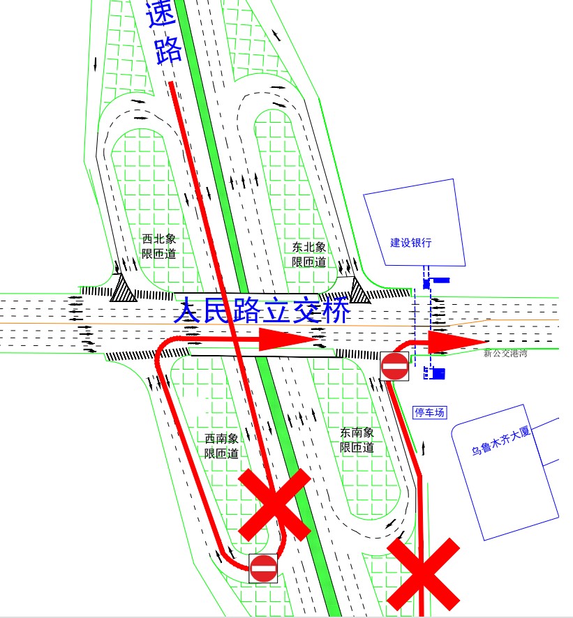 原河滩路经人民路立交桥前往天山区方向的车辆,可由华凌市场立交桥、华凌集团立交桥、广汇立交桥、珠江路立交桥、三屯碑立交桥及东、西外环和其他市区道路绕行。