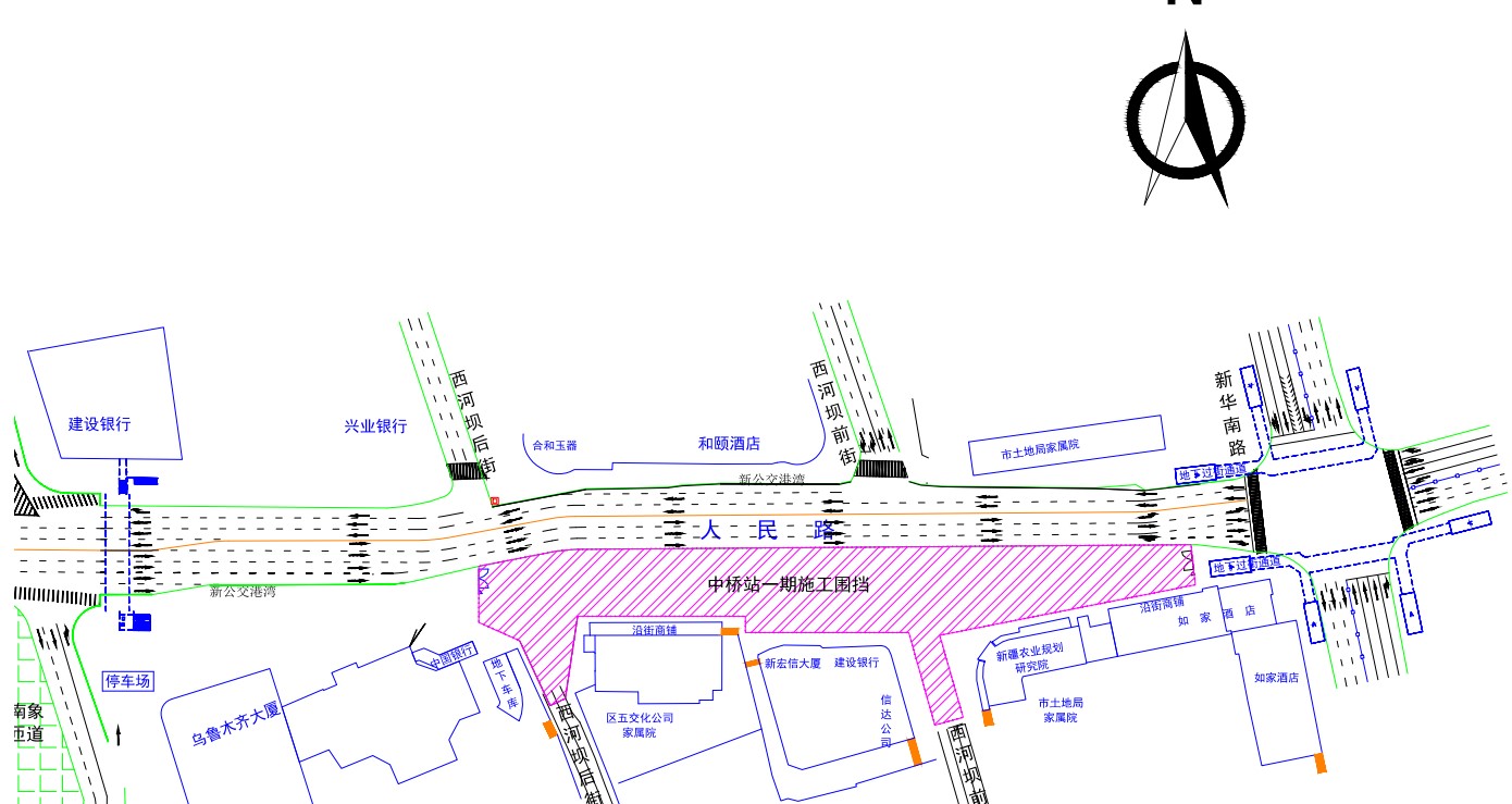 施工路段:人民路(新华南路-西河坝后街之间路段)半封闭施工,围挡占用人民路南侧5条机动车道及部分人行道,围闭后该路段由双向8车道变为双向5车道(向东3车道,东向西2车道),围挡路段两侧预留人行通道(如图所示)。