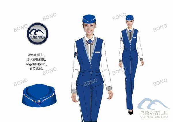 乌鲁木齐地铁职业服装设计结合地铁行业和乌鲁木齐特有的地域文化特点,将新疆民族特色的艾德莱丝绸花型融入到制服设计理念中,款式设计及面料选择上考虑了轨道交通行业的特定需求及新疆的气候条件。男士西服套装为藏蓝色,与领带、帽子、颜色一致,搭配得体,亲和力十足。女士西服为天蓝色,活力十足,清新自然,艾德莱斯绸元素的领花和帽子细节相互呼应,体现新疆特色的同时,显示出女性的婉约。运营时市民将感受到身着制服、青春率性的“儿子娃娃”和“丫头子”热情周到的服务。