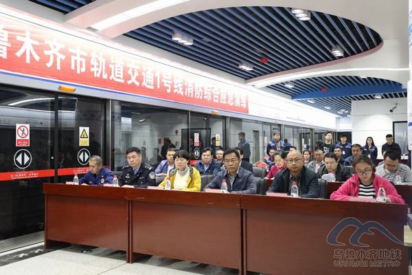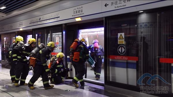 凌晨00:00,消防综合应急演练正式开始:乌鲁木齐轨道交通1号线下行1020次列车自八楼站运行至王家梁站临进站时,5号车厢突发火情。城轨集团运营分公司立即启动专项应急预案,成立现场指挥部,并向市应急管理局、消防、急救、公安等应急救援部门请求支援。王家梁站工作人员和公安民警组织乘客疏散,进行前期救援处置工作。接到报警后,市消防支队先后调集4车15人赶往事故现场进行处置。00时09分,消防支队救援官兵到场,救援人员穿着灭火防护服,携带导向绳、水枪、水带、担架、逃生面罩等灭火救援器材深入火场实施内部侦察和人员搜救。经过处置,火势被成功扑灭,2名受伤乘客最终被成功救出,移交给急救中心医护人员。