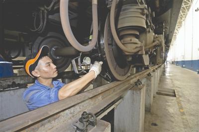 随后,李雪峰也钻进了列车底部,对已经检修的部件再次进行检查。1.73米的李雪峰只能弓着腰,小步穿梭在车底,额头上豆大的汗水也不断顺着脸颊流下。他告诉记者,这还不是车底最热的时候。“有时候列车刚刚回来就要进行紧急检查,车底的电阻制动箱、牵引电机都非常烫,表面温度高达80℃。车下作业的检修人员不仅要忍受高温,还必须非常谨慎,绝对不能触碰到这些部件。”