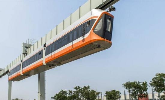 中车四方设计制造的悬挂式单轨列车,具有完全自主知识产权,可实现3至5列的灵活编组,载客量可达到300至510余人。