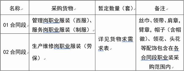 2. 招标内容:管理岗职业服装、服务岗职业服装、生产维修岗职业服装共3个岗位职业服装及其配饰,具体详见第五章货物需求。