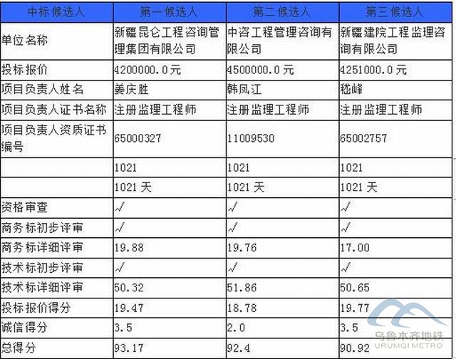 北京中昌工程咨询有限公司受乌鲁木齐城市轨道集团有限公司的委托对乌鲁木齐机场(北区)改扩建市政配套工程(二期)土建施工监理和乌鲁木齐机场北区改扩建工程市政配套(T4航站楼~机场东站)机场东站精装修监理的招标的评审工作已经结束,评标委员会经过评审后确定了本项目标段的中标候选人,现将中标候选人情况予以公示(时间从2021年04月23日至 2021年04月26日止),中标候选人具体情况如下: