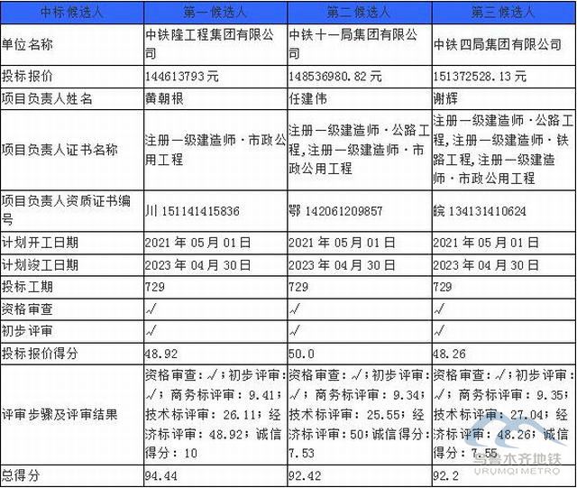 北京中昌工程咨询有限公司受乌鲁木齐城市轨道集团有限公司的委托对乌鲁木齐机场(北区)改扩建市政配套工程(二期)土建施工的招标的评审工作已经结束,评标委员会经过评审后确定了本项目标段的中标候选人,现将中标候选人情况予以公示(时间从2021年04月30日至2021年05月03日止),中标候选人具体情况如下: