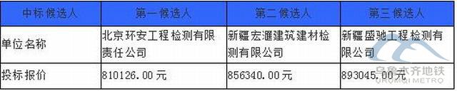 北京中昌工程咨询有限公司受乌鲁木齐城市轨道集团有限公司的委托对乌鲁木齐机场(北区)改扩建市政配套工程(二期)质量检测的招标的评审工作已经结束,评标委员会经过评审后确定了本项目标段的中标候选人,现将中标候选人情况予以公示(时间从2021年05月06日至 2021年05月09日止),中标候选人具体情况如下: