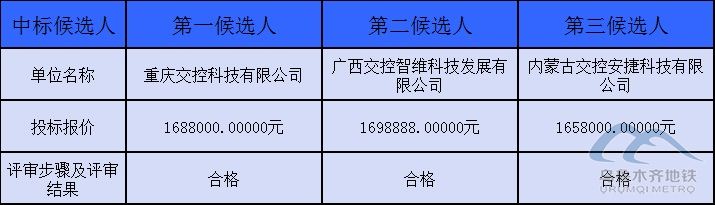 乌鲁木齐地铁咨询有限公司受乌鲁木齐城市轨道集团有限公司的委托对乌鲁木齐轨道交通1号线2022年专用设备维修委外项目01-03合同段的招标的评审工作已经结束,评标委员会经过评审后确定了本项目标段的中标候选人,现将中标候选人情况予以公示(时间从2022年07月06日至 2022年07月09日止),中标候选人具体情况如下: